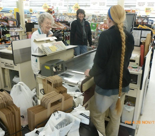Emily has been our favorite checker down at Pac n Save for several years. She had long hair when we first met her and has continued to let it grow. When I asked about taking her picture this afternoon, she said that she had 4 inches cut off recently. She is a good checker and sacker; we have never known her to make a mistake. Grocery shopping in Seward continues to be a social event. Elaine was able to do some "family" visiting with one of the ladies we saw in the produce department. Vikki was next in line as Elaine was paying for our groceries. There is a possibility of snow on Friday and that may have had something to do with our "stocking up" on groceries. I think we could get by for several days if we were snowbound. It would be interesting to know what the first thing we would need or want but Elaine is pretty ingenious in coming up with substitutes. Our loaf of raisin bread won't last beyond the weekend, but I'm sure she has an alternative in mind if necessary. Plus the fact that it's only 4 blocks to the Save Mart store if necessary.